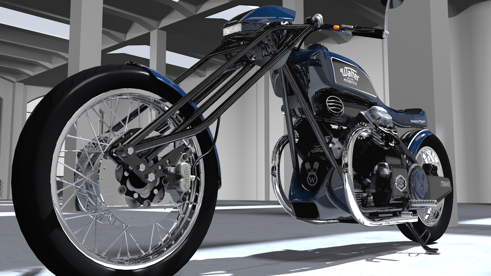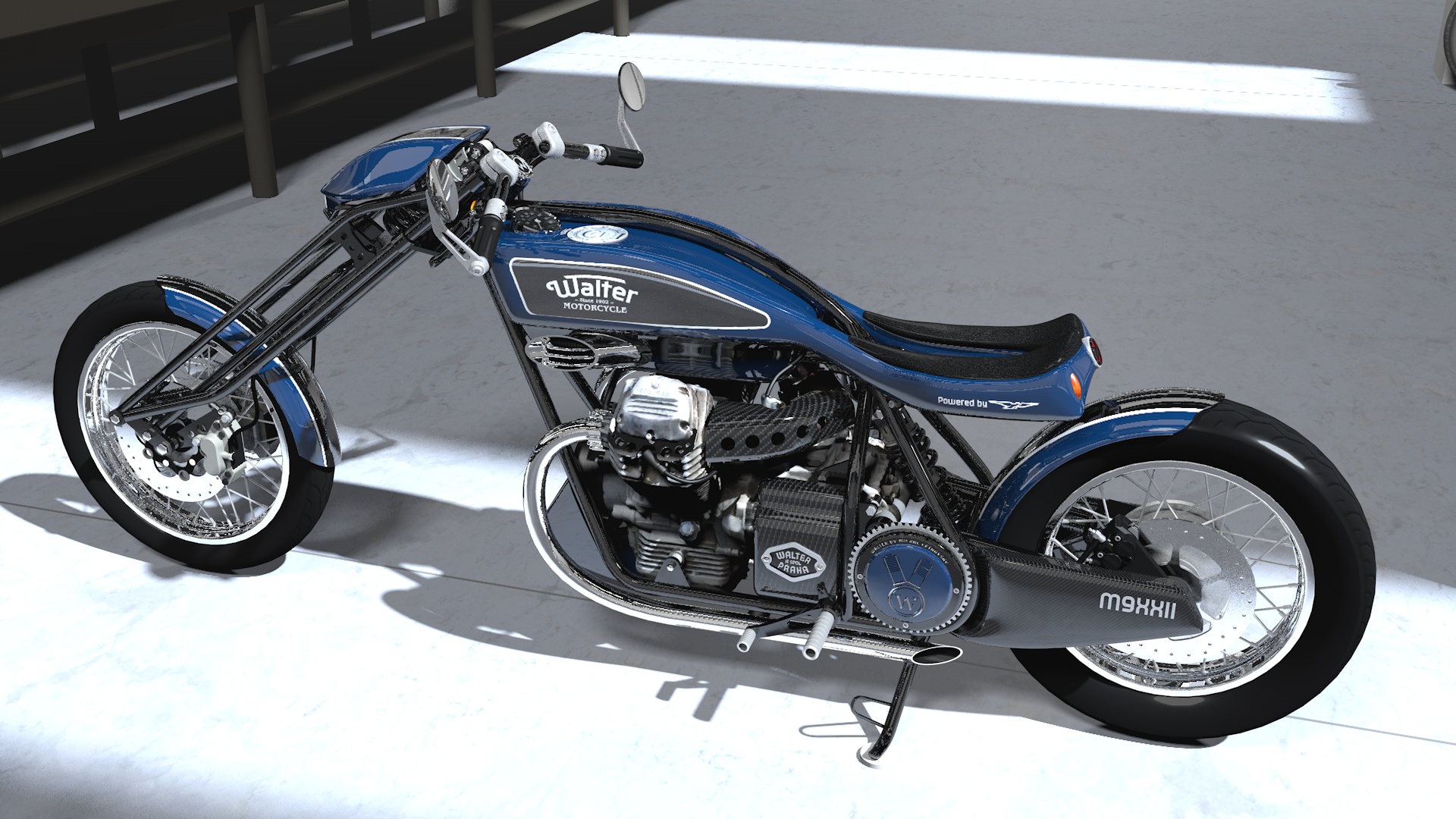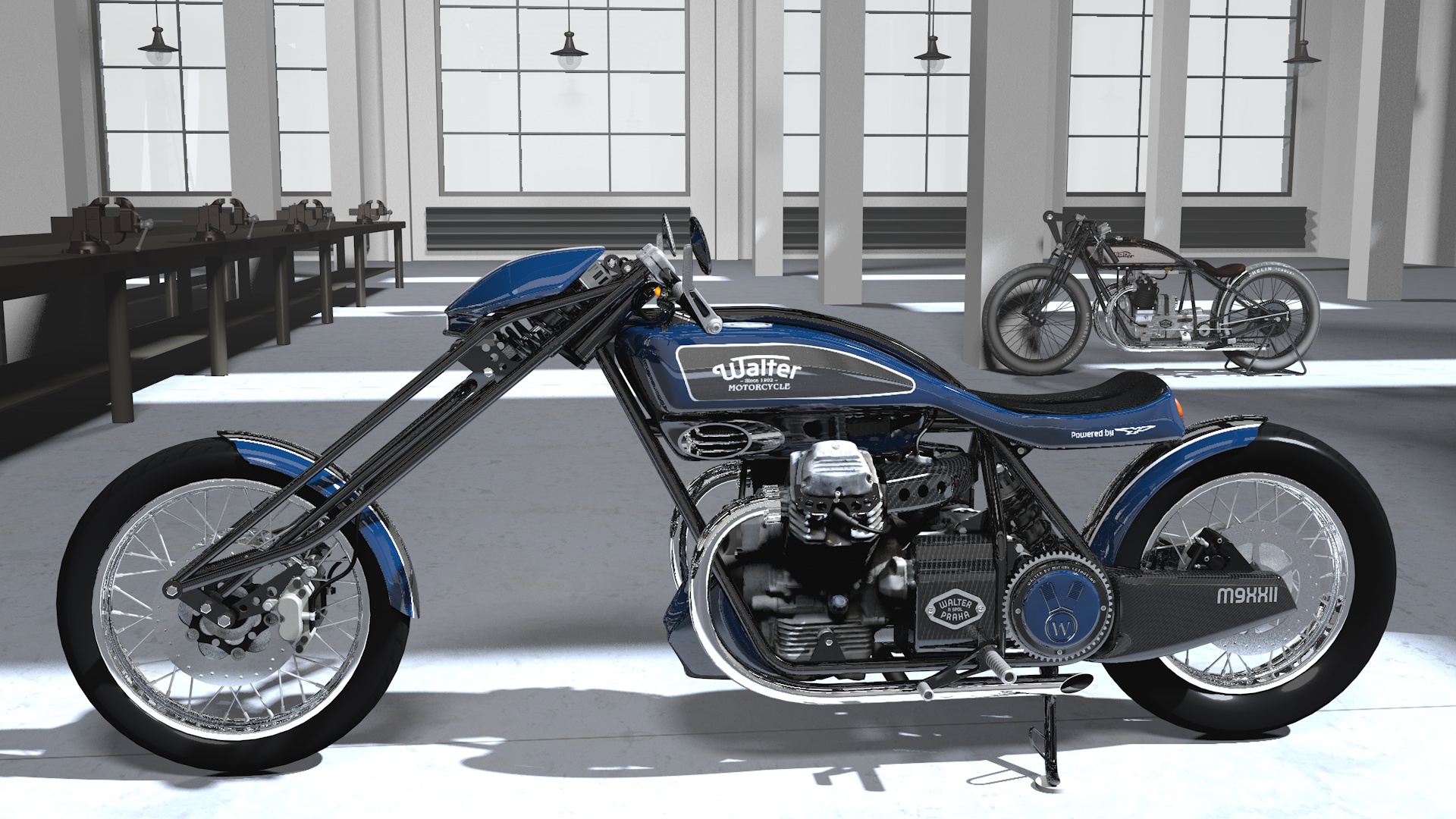 Walter B mě však natolik uchvátil, že jsem se rozhodl najít o těchto motocyklech, vyráběných od roku 1902 Josefem Walterem v Praze, více. Vytvořil jsem na tomto základě jak 3D modely původních strojů, tak i jejich moderní koncepty. Viz https://chopperweb.cz/mc/category/motocykly/.